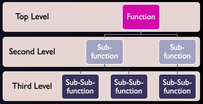 The basic approach to modularization is to consider a top-down design where the top level defines the main function, and a separate module represents each smaller function in the program (see Figure 21).